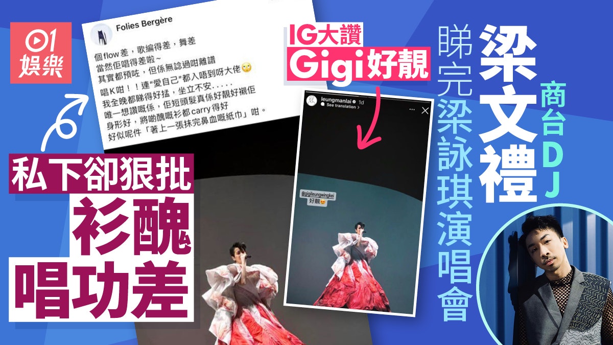 Web 有不少的網民都指梁文禮是雙面人Gigi聽後搖頭說我諗呢樣嘢就唔係好關我事咁我做足自己本份又覺得有嚟睇嘅人鍾意就得啦 Gigi被問到之後若新歌宣傳在電台遇上他會否尷尬時她則笑著說未諗過呢個問題 從中可以見到Gigi高情商的回應 從回應中可以見到Gigi的高情商 葉志明攝 點撃睇下梁詠琪演唱會的精彩. Web 梁文禮狠批梁詠琪演唱會 圖片來源東方新地 梁詠琪演唱會表演 圖片來源東方新地 商台DJ梁文禮被揭雙面人明讚暗踩 當然佢唱得差啦 商台DJ梁文禮在頭場看完梁詠琪演唱會後在IG限時動態中大讚梁詠琪在台上好靚但是在私人Facebook AC中卻大罵她的演唱會寫道 個flow差歌編得差舞差當然佢唱得.
